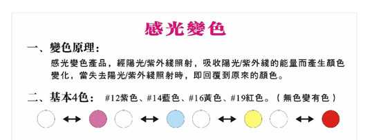 2、應(yīng)避免感光變色粉與紫外光吸收劑同時(shí)使用。